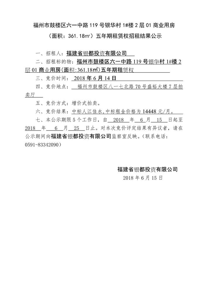 銀華村1#樓2層01商業(yè)用房中標(biāo)公示