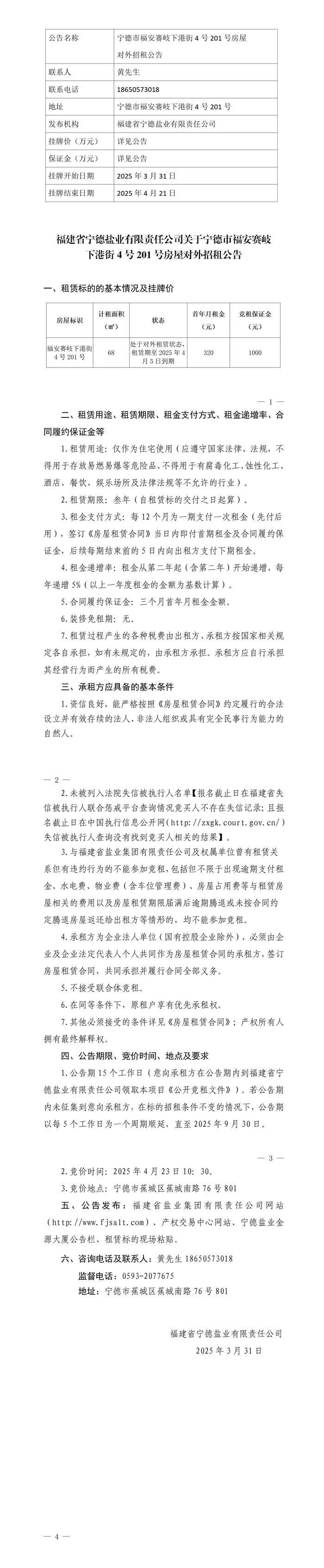 寧德市福安賽岐下港街4號(hào)201號(hào)房屋對外招租公告