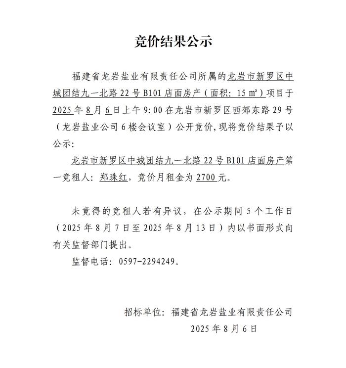 龍巖市新羅區(qū)中城團(tuán)結(jié)九一北路22號B101店面房產(chǎn)招租競價(jià)結(jié)果公示
