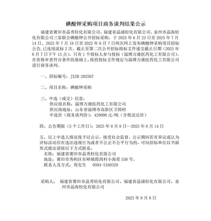 碘酸鉀采購項目商務談判結(jié)果公示20250808