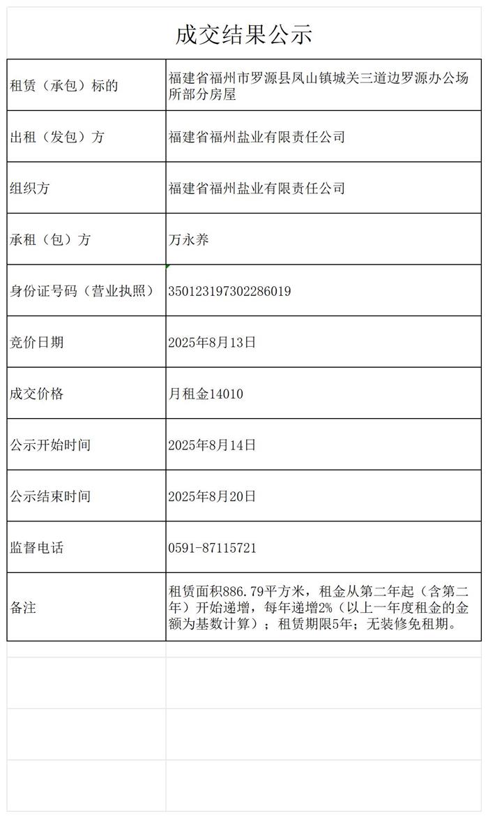 福州市羅源縣鳳山鎮(zhèn)城關三道邊羅源辦公場所部分房屋出租成交結(jié)果公示